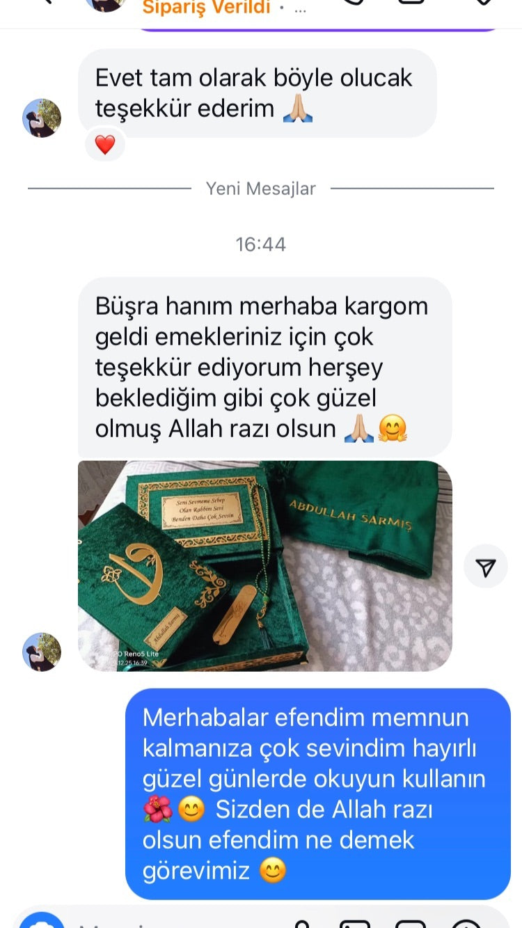 Her Kur’an seti, talep ettiğiniz isimle özel olarak işlenir. Bu sayede ürün hem kişisel hem de değerli bir hatıraya dönüşür.
